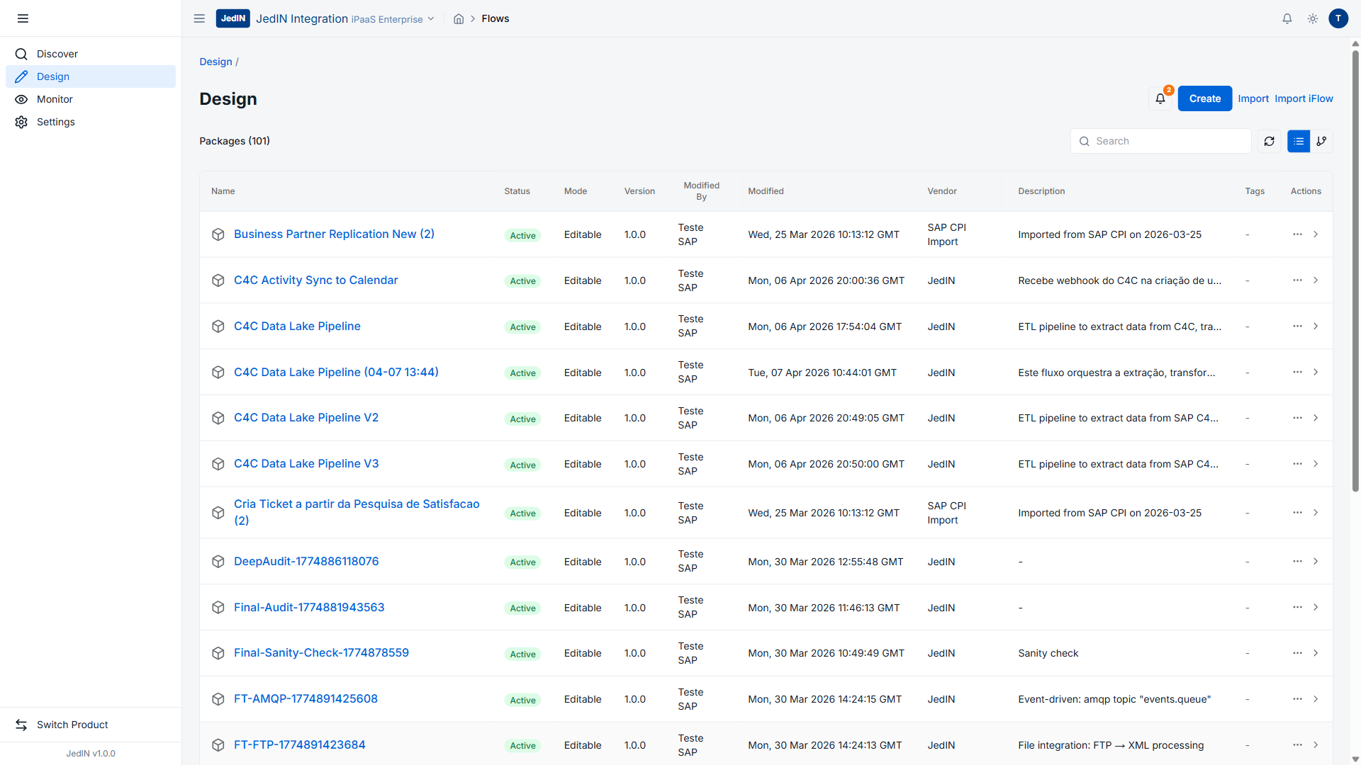 A migração é real. Conteúdo SAP CPI foi importado e está sendo gerenciado ativamente ao lado de pacotes nativos do JedIN. A plataforma não exige uma adoção tudo-ou-nada.