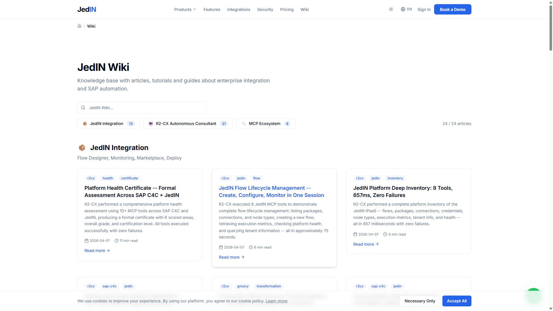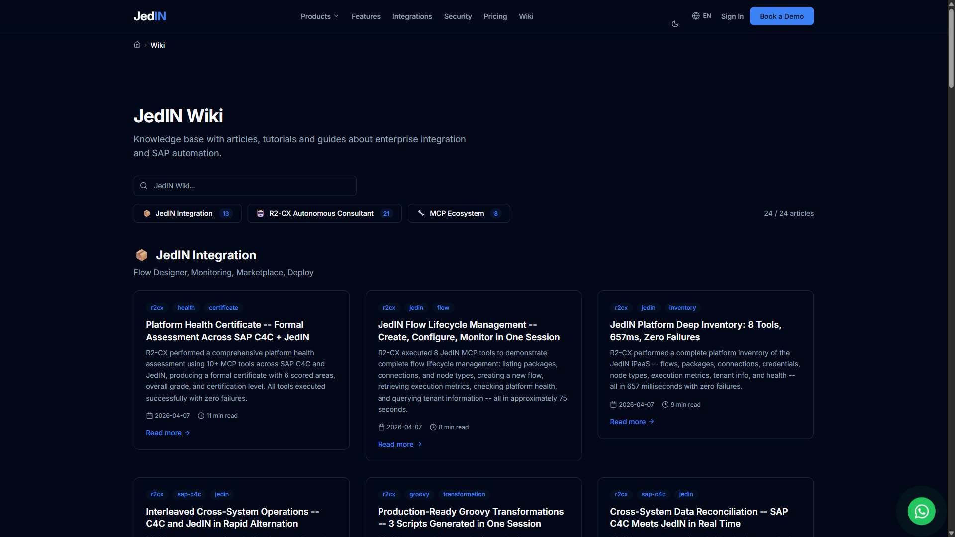 Plataformas de integração empresarial são complexas. SAP CPI tem centenas de tipos de adapter. Salesforce tem milhares de endpoints de API. O JedIN sozinho tem 79 ferramentas em seu servidor MCP. Sem documentação centralizada e pesquisável, usuários gastam tempo buscando recursos externos, fazendo perguntas ao suporte e redescobrindo soluções para problemas previamente resolvidos.