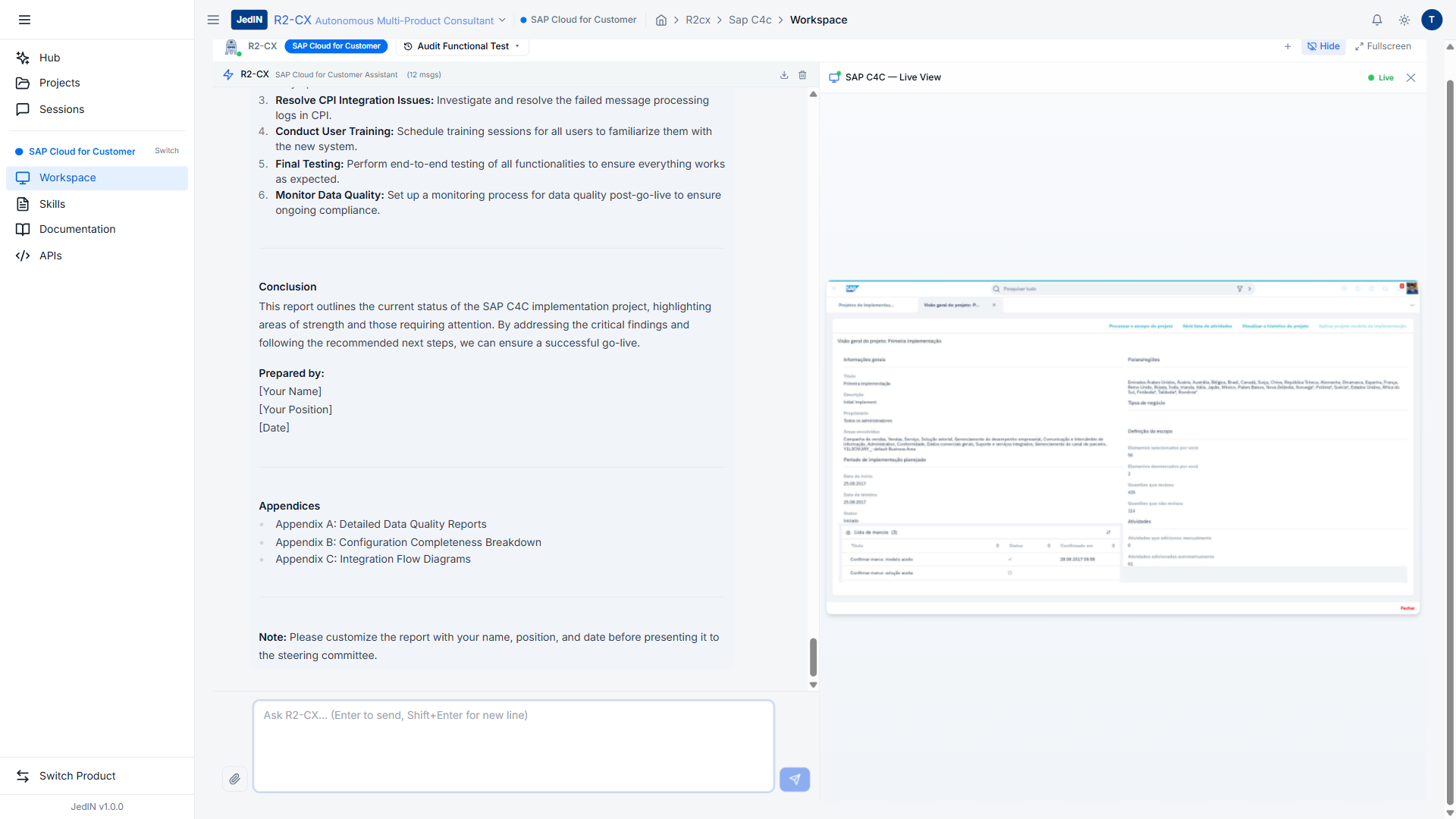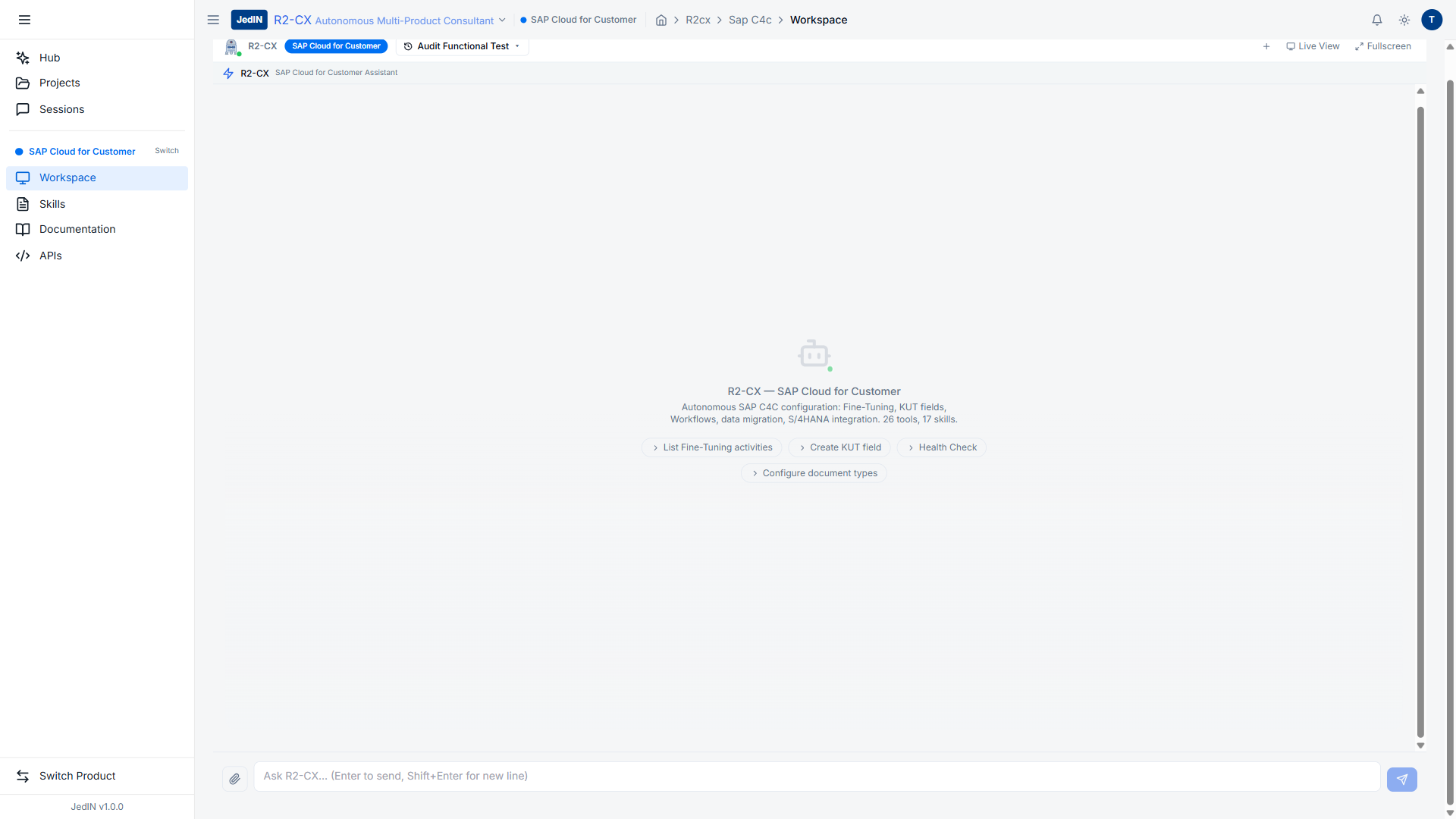 O R2-CX evoluiu de um assistente para um único sistema SAP C4C para um hub autônomo de consultoria multi-produto, suportando 14 sistemas alvo com 259 ferramentas combinadas. Três sistemas estão prontos para produção, dois estão prontos para API e nove estão em beta -- todos acessíveis a partir de uma interface hub unificada com busca, filtragem e acesso direto ao workspace.
