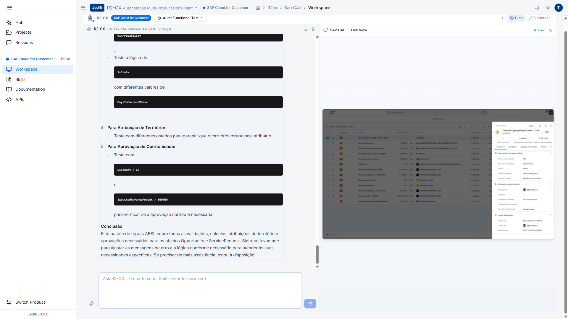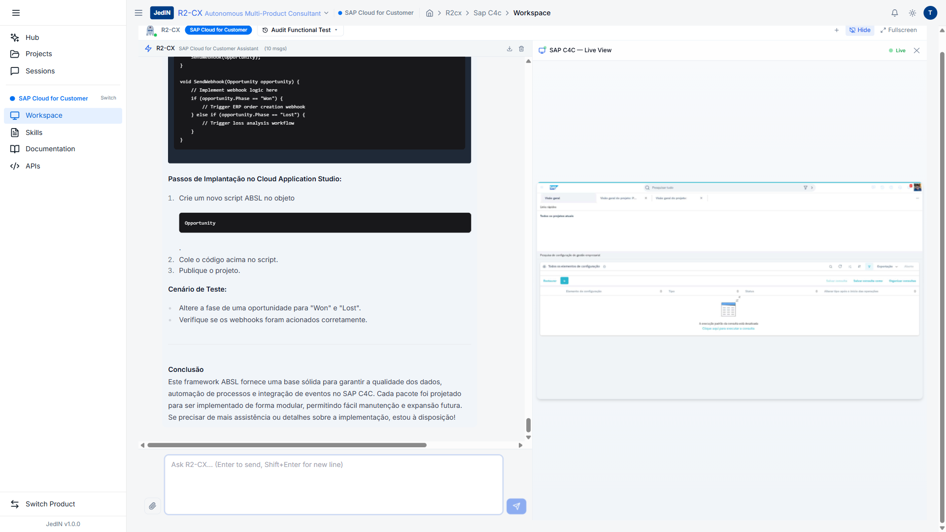 Guia passo a passo para gerar código ABSL com R2-CX para SAP Cloud for Customer — cobrindo templates de validação, cálculo, atribuição de território, deduplicação, aprovação e visibilidade com prompts exatos e instruções de deploy.