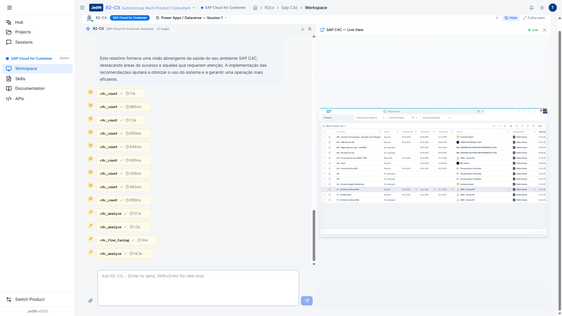 O R2-CX executou aproximadamente 15 chamadas de ferramentas em ambos SAP C4C (c4c_count, c4c_analyze) e JedIN (jedin_list_flows, jedin_list_packages, jedin_get_execution_metrics, jedin_list_connections, jedin_get_tenant_info) para produzir uma reconciliação cross-system unificada em aproximadamente 90 segundos.
