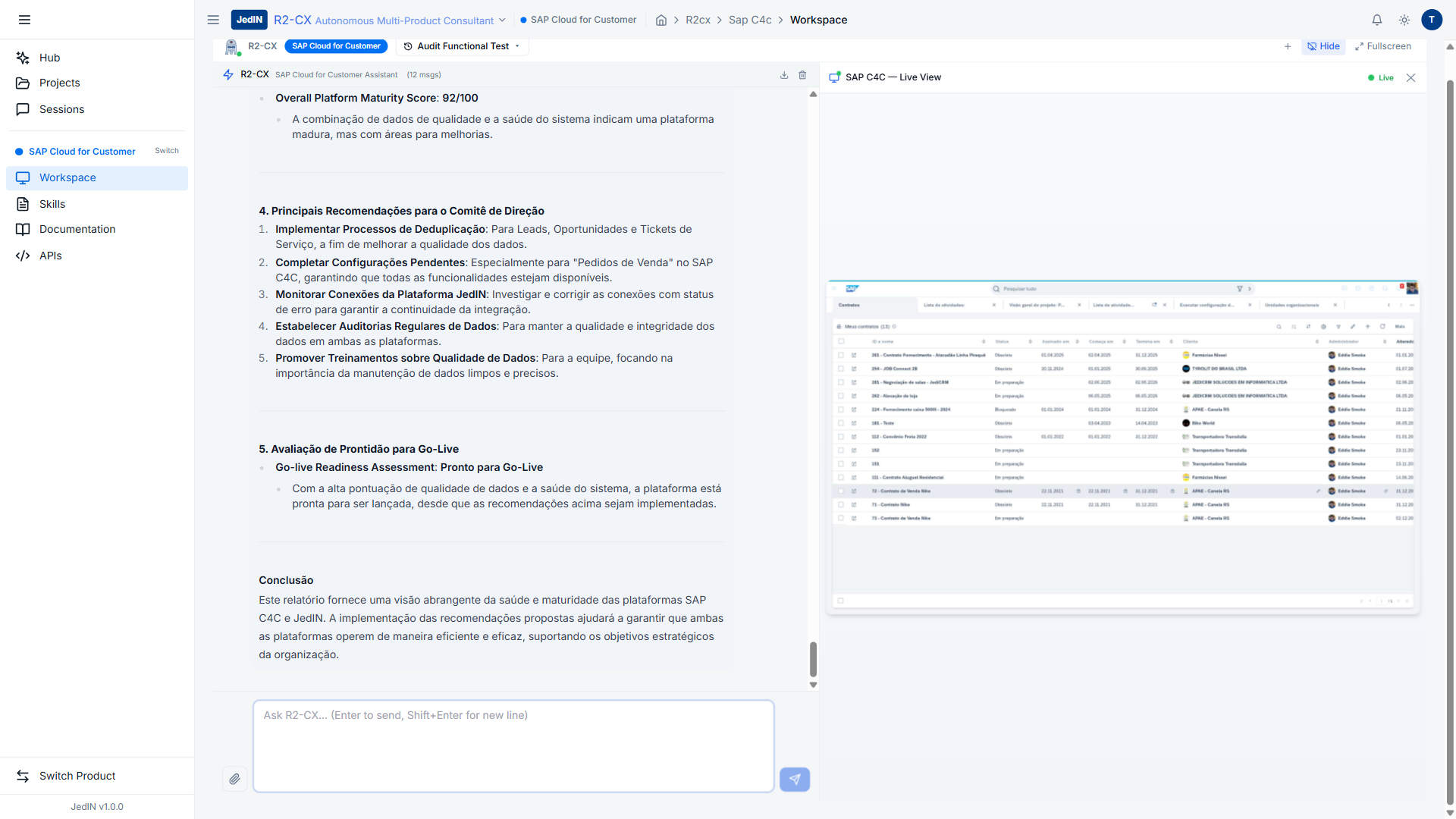 Guia passo a passo para usar o R2-CX para auditar seu tenant SAP C4C e a plataforma de integracao JedIN simultaneamente — combinando saude do CRM e saude da integracao em um relatorio executivo.