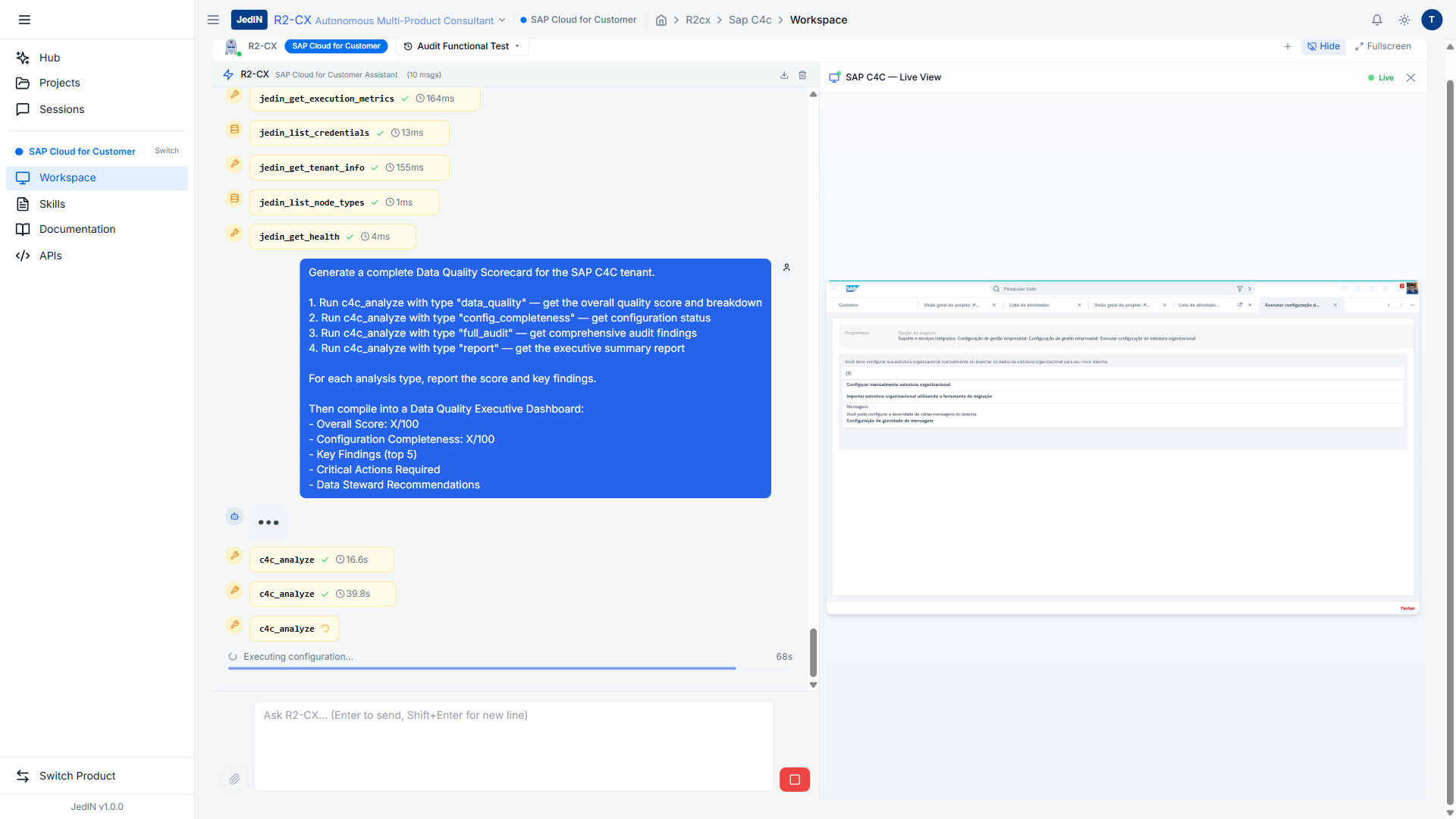 Guia passo a passo para usar o R2-CX para auditar seu tenant SAP C4C e a plataforma de integracao JedIN simultaneamente — combinando saude do CRM e saude da integracao em um relatorio executivo.