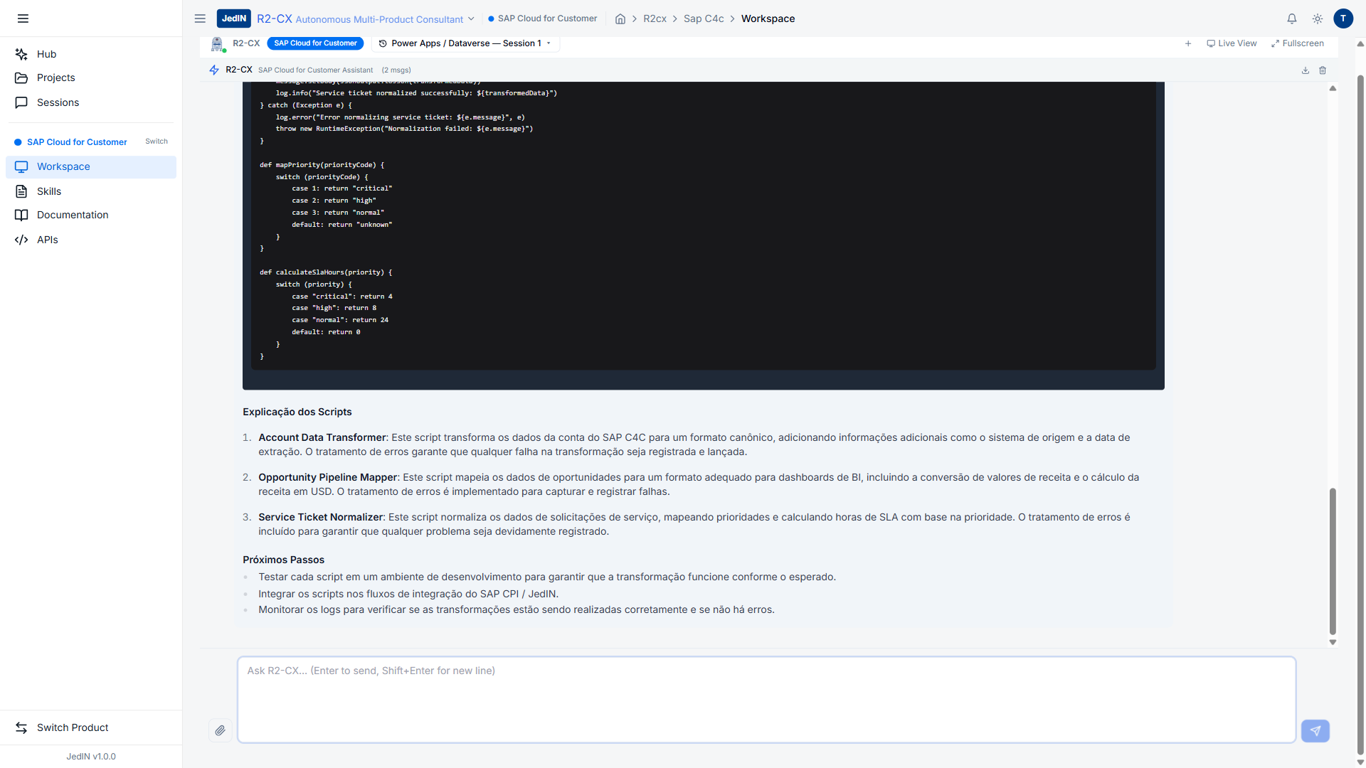 Guia passo a passo para gerar scripts Groovy de transformação prontos para produção usando o R2-CX — de mapeamento de campos SAP C4C a conversão de moedas, com código para colar diretamente no JedIN Flow Designer ou SAP CPI.