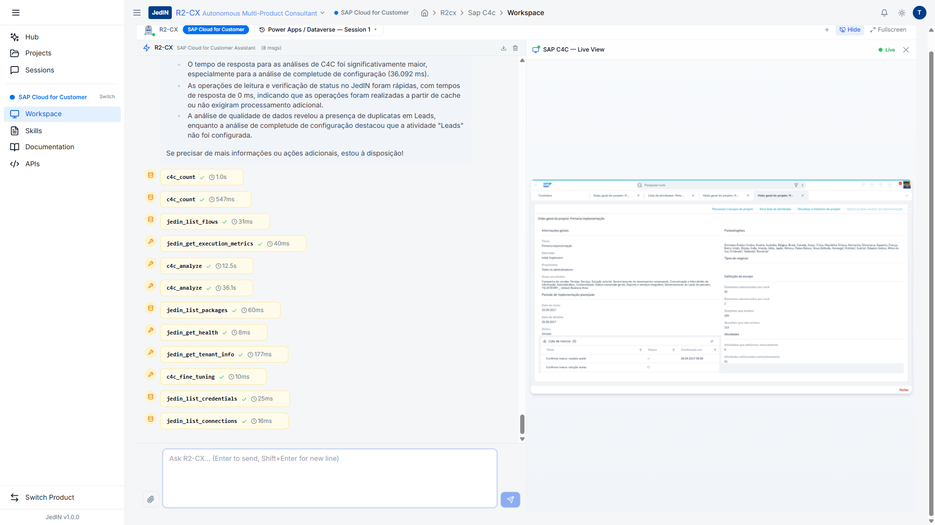 O R2-CX executou aproximadamente 15 chamadas de ferramentas em ambos SAP C4C (c4c_count, c4c_analyze) e JedIN (jedin_list_flows, jedin_list_packages, jedin_get_execution_metrics, jedin_list_connections, jedin_get_tenant_info) para produzir uma reconciliação cross-system unificada em aproximadamente 90 segundos.
