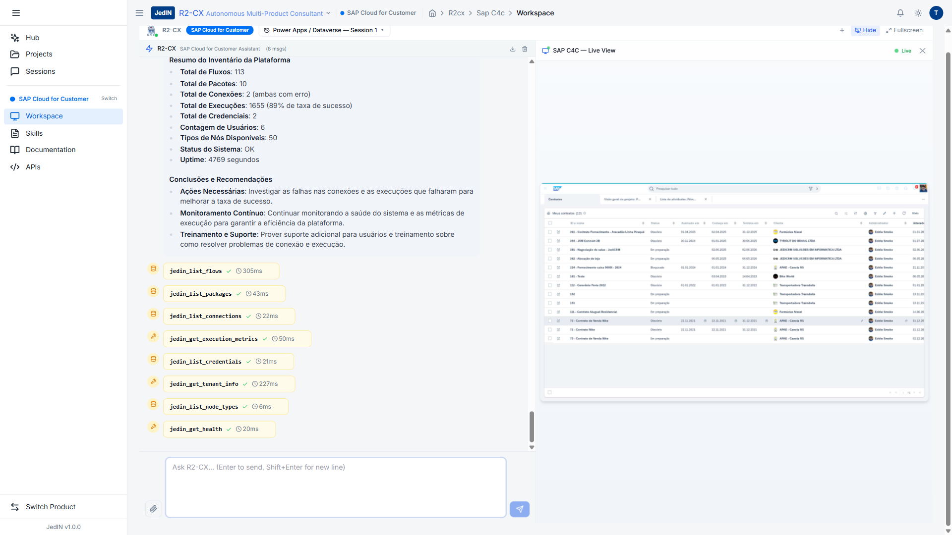 O R2-CX consultou toda a saúde da plataforma JedIN em menos de meio segundo — fluxos, pacotes, conexões, nós e saúde do sistema em uma única sessão de IA.