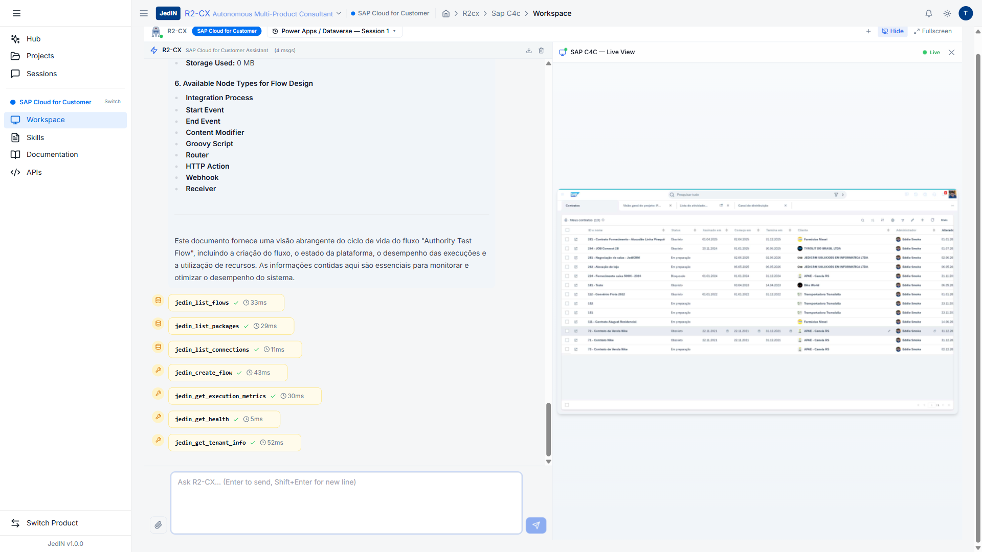 O R2-CX executou aproximadamente 15 chamadas de ferramentas em ambos SAP C4C (c4c_count, c4c_analyze) e JedIN (jedin_list_flows, jedin_list_packages, jedin_get_execution_metrics, jedin_list_connections, jedin_get_tenant_info) para produzir uma reconciliação cross-system unificada em aproximadamente 90 segundos.