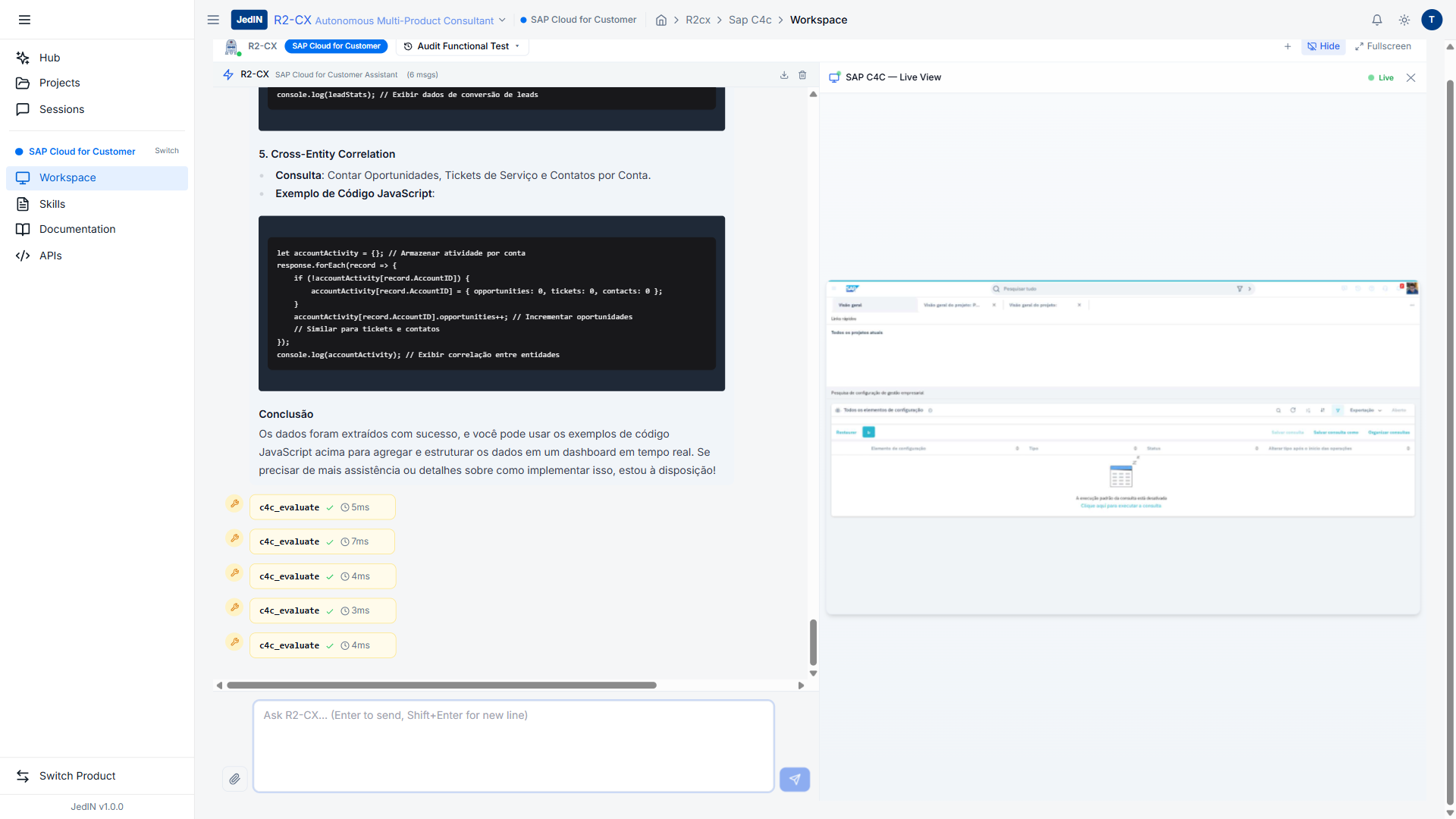 O R2-CX lida com todas essas restrições de forma transparente. Ele executa JavaScript dentro do navegador autenticado via c4c_evaluate, que tem acesso completo aos endpoints OData através de cookies de mesma origem. Toda a lógica de agregação é executada como JavaScript dentro do contexto do navegador.