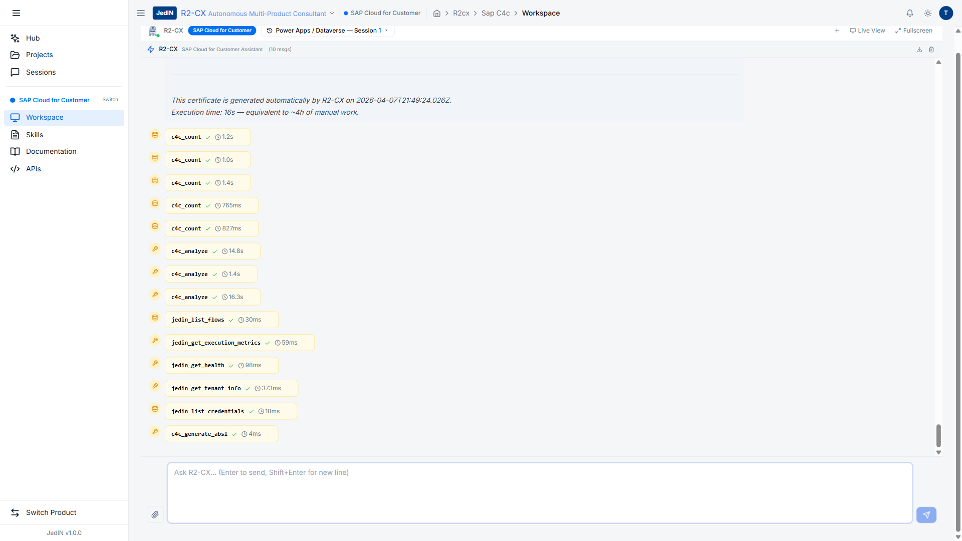 O R2-CX automatiza todo o processo de avaliacao. Usando seu ecossistema de ferramentas MCP, ele acessa tanto SAP C4C quanto JedIN simultaneamente, coleta metricas ao vivo, avalia contra limites definidos e produz um certificado formal de saude com areas pontuadas, achados acionaveis e um nivel de certificacao. O processo inteiro leva minutos, nao dias, e pode ser repetido sob demanda -- semanalmente, diariamente ou ate como parte de um pipeline CI/CD.