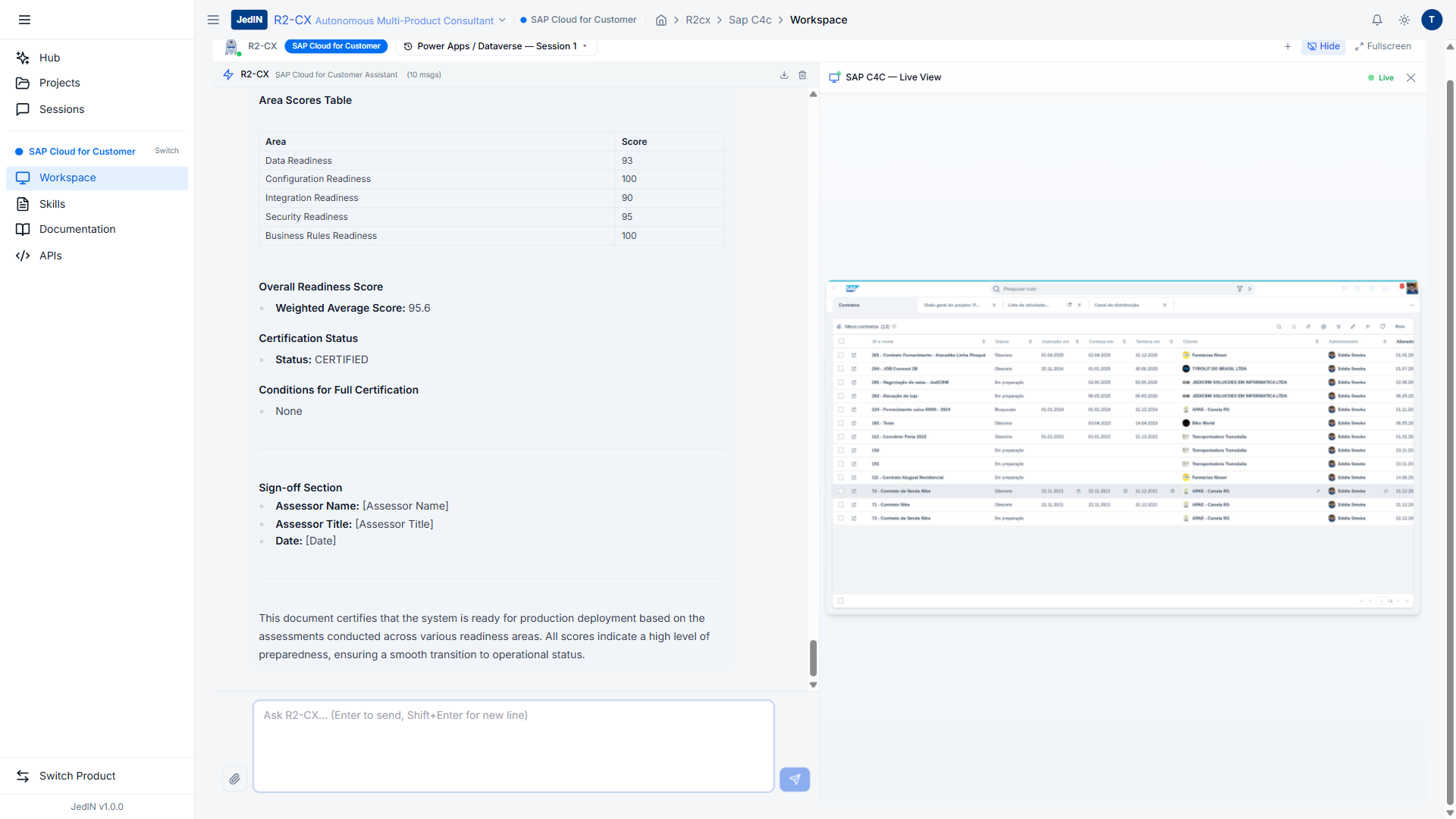 O R2-CX realizou uma avaliacao abrangente de saude da plataforma usando mais de 10 ferramentas MCP em SAP C4C e JedIN, produzindo um certificado formal com 6 areas pontuadas, nota geral e nivel de certificacao. Todas as ferramentas executaram com sucesso e zero falhas.