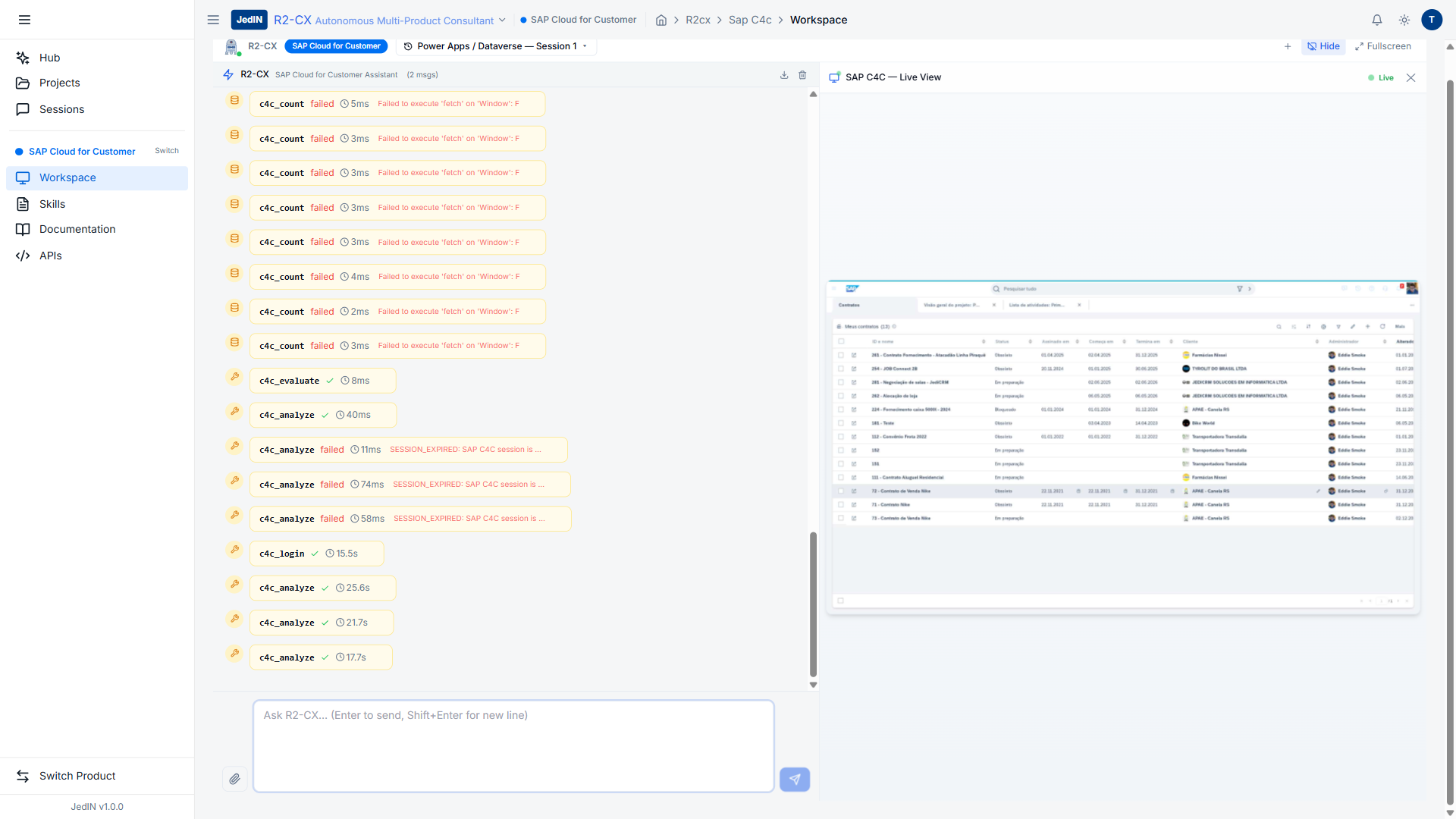 O R2-CX realizou uma avaliacao abrangente de saude da plataforma usando mais de 10 ferramentas MCP em SAP C4C e JedIN, produzindo um certificado formal com 6 areas pontuadas, nota geral e nivel de certificacao. Todas as ferramentas executaram com sucesso e zero falhas.